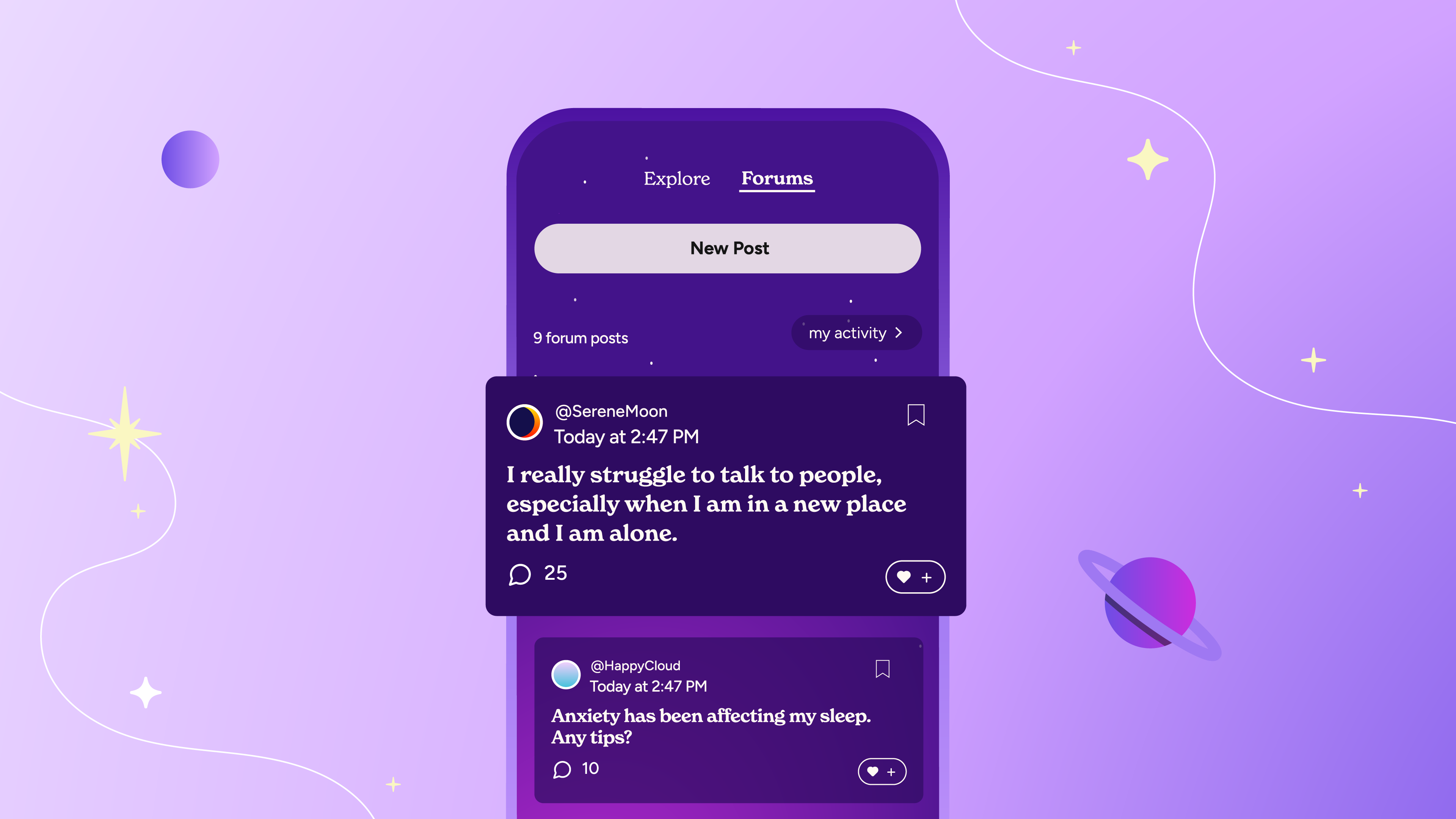 In our peer-support spaces, you'll find people who get what you're going through (because they've been there, too). Share your story, offer encouragement, or just listen — in a carefully moderated environment to keep things supportive and safe.